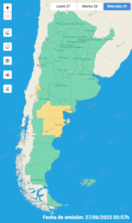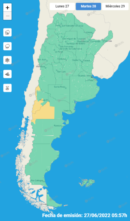 En Neuquén, el SMN detalló que hay alerta amarilla por vientos el martes a la mañana y por nevadas el miércoles por la mañana en Cordillera de Aluminé – Cordillera de Chos Malal – Cordillera de Loncopué – Cordillera de Minas – Cordillera de Picunches – Cordillera de Ñorquín.