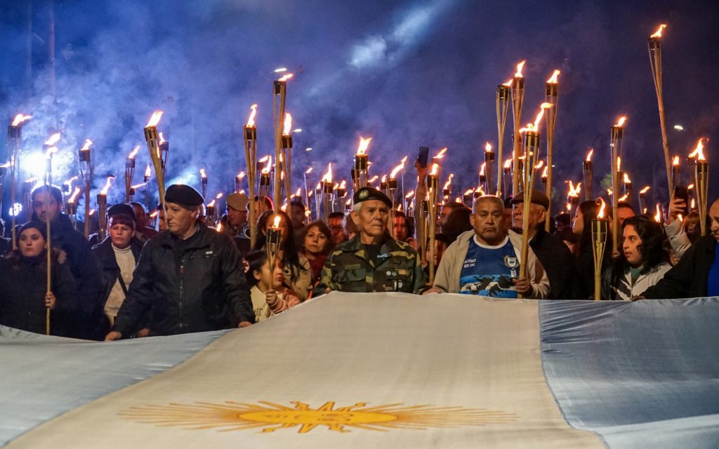 Todos los presentes se trasladarán hasta la plaza “Puerto Argentino” de la mano de la Marcha de Antorchas, acompañada por el movimiento de tambores de la Banda Militar. Cuando el reloj marque la medianoche, se entonarán fervientemente los himnos y la Marcha de Malvinas.
