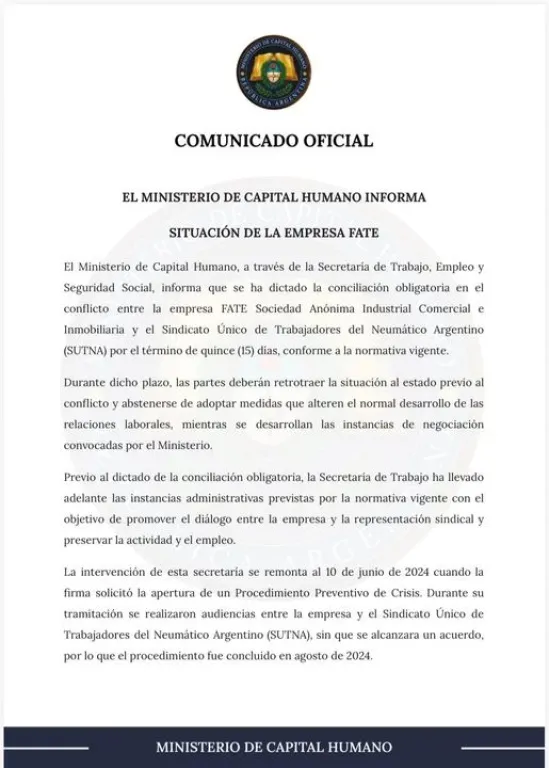 Por su parte, el Ministerio de Capital Humano, del cual depende la Secretaría de Trabajo, expresó a través de un comunicado que, previo a la conciliación obligatoria, la cartera comandada por Julio Cordero “llevó adelante las instancias administrativas previstas por la normativa vigente con el objetivo de promover el diálogo” entre la empresa y el sindicato.